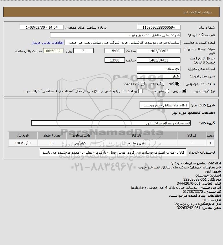 شرح کلی نیاز: 1 قلم کالا مطابق شرح پیوست .