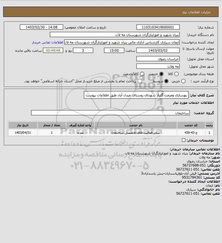 نام سازمان خریدار: بنیاد شهید و امورایثارگران شهرستان مه لات