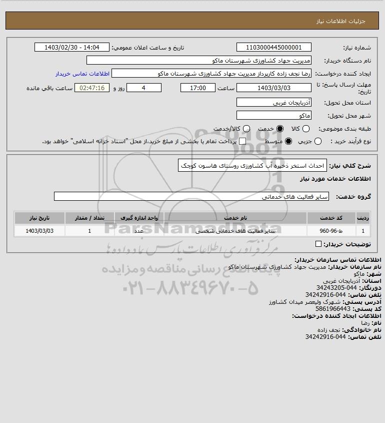 استعلام احداث استخر ذخیره آب کشاورزی روستای هاسون کوچک, استعلام احداث استخر ذخیره آب کشاورزی روستای هاسون کوچک
