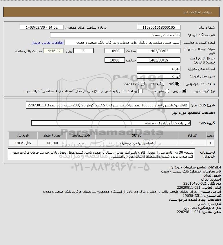شرح کلی نیاز: کالای درخواستی تعداد 100000 عدد لیوان یکبار مصرف با کیفیت. گرماژ بالا.(200 بسته 500 عددی).27873011