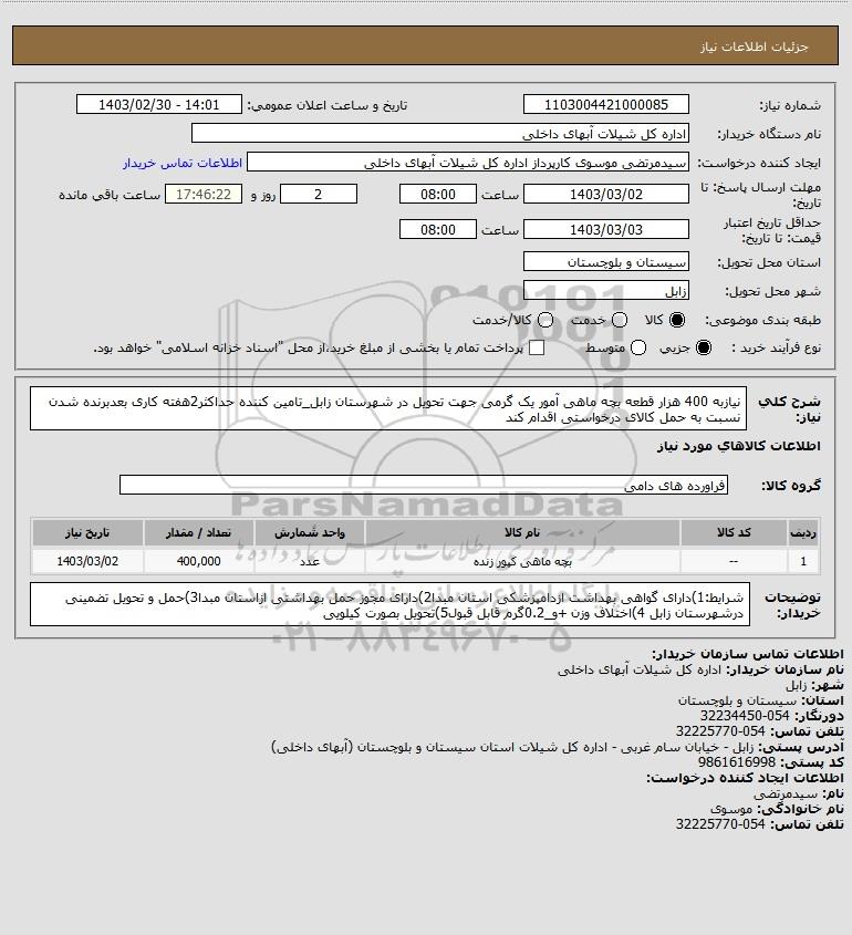 شرح کلی نیاز: نیازبه 400 هزار قطعه بچه ماهی آمور یک گرمی جهت تحویل در شهرستان زابل_تامین کننده حداکثر2هفته کاری بعدبرنده شدن نسبت به حمل کالای درخواستی اقدام کند