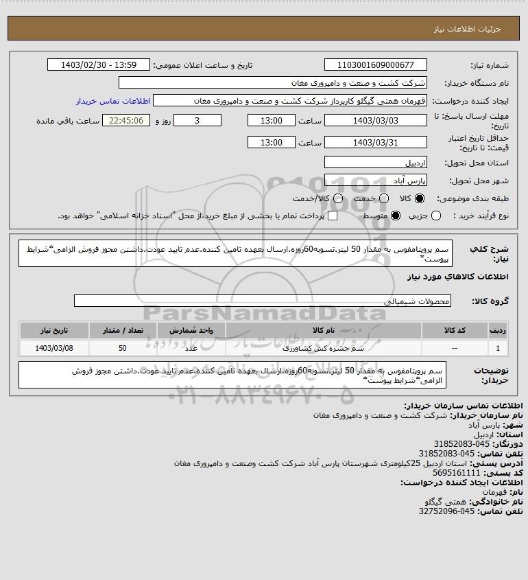 شرح کلی نیاز: سم پروپتامفوس به مقدار 50 لیتر.تسوبه60روزه.ارسال بعهده تامین کننده.عدم تایید عودت.داشتن مجوز فروش الزامی*شرایط پیوست*
