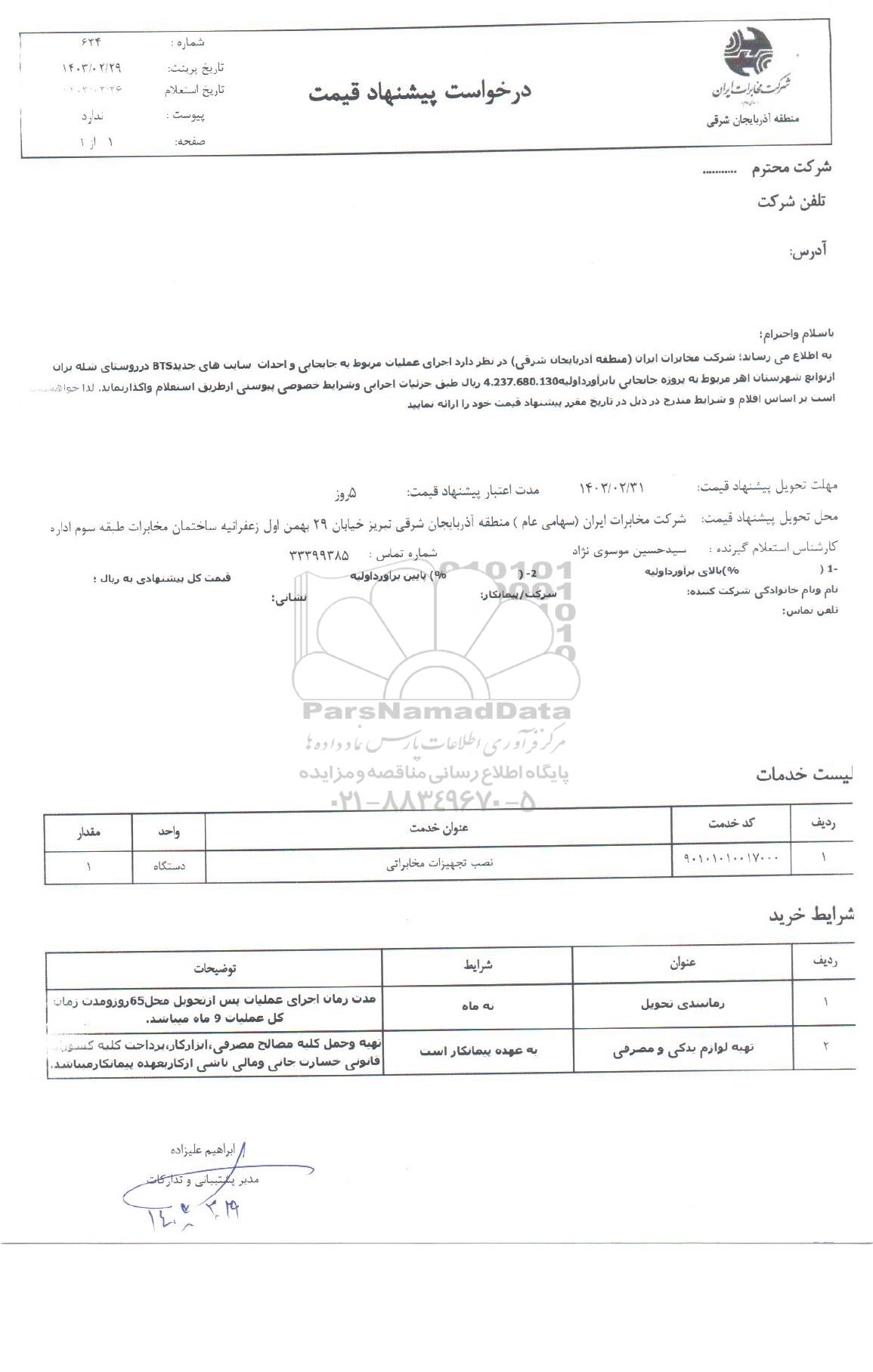 شرکت مخابرات ایران (منطقه آذربایجان شرقی) در نظر دارد اجرای عملیات مربوط به جابجایی و احداث سایت های جدید BTS در روستای شله بران از توابع شهرستان اهر مربوط به پروژه جابجایی با برآورد اولیه 4.237.680.130 ریال طبق جزییات اجرایی و شرایط خصوصی پیوستی از طریق استعلام واگذار نماید. لذا خواهشمند است براساس اقلام و شرایط مندرج در ذیل در تاریخ مقرر پیشنهاد قیمت خود را ارائه نمایند.