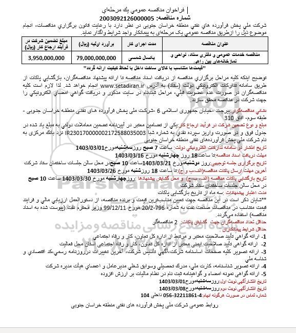 شرکت ملی پخش فرآورده های نفتی منطقه خراسان جنوبی در نظر دارد با رعایت قانون برگزاری مناقصات، انجام موضوع ذیل را از طریق مناقصه عمومی یک مرحله ای به پیمانکار واجد شرایط واگذار نماید.