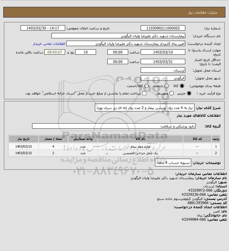 | 1 | -- | لوازم مهار بیمار | عدد | 4 | 1403/03/15 |