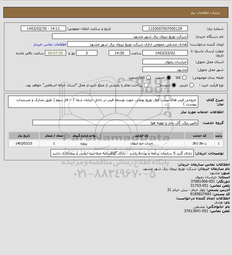 نام دستگاه خریدار:شرکت توزیع نیروی برق شهر مشهد