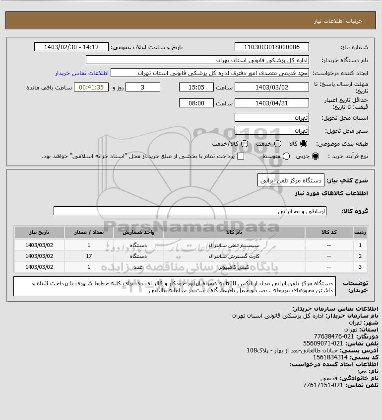 شرح کلی نیاز: دستگاه مرکز تلفن ایرانی