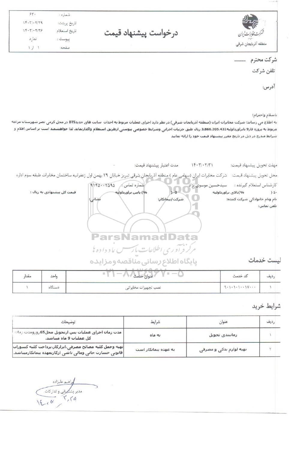 شرکت مخابرات ایران (منطقه آذربایجان شرقی) در نظر دارد اجرای عملیات مربوط به احداث سایت های جدید BTS در محل کرمی نصر شهرستان مراغه مربوط به پروژه فاز 9 با برآورد اولیه 3.866.205.431 ریال طبق جزییات اجرایی و شرایط خصوصی پیوستی از طریق استعلام واگذار نماید. لذا خواهشمند است براساس اقلام و شرایط مندرج در ذیل در تاریخ مقرر پیشنهاد قیمت خود را ارائه نمایند.