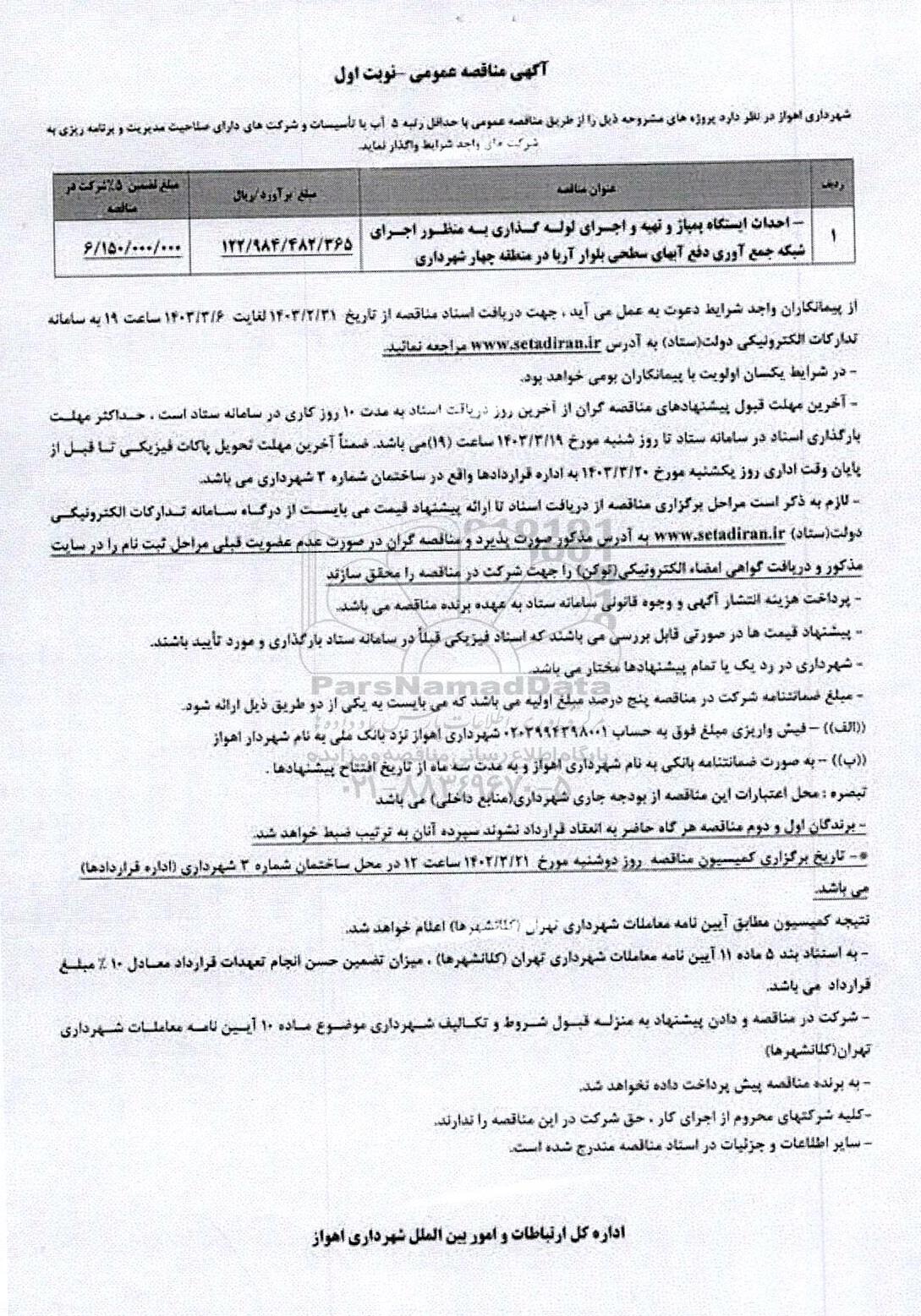 شهرداری اهواز در نظر دارد پروژه مشروحه ذیل را از طریق مناقصه عمومی با حداقل رتبه 5 آب یا تاسیسات و شرکت های دارای صلاحیت مدیریت و برنامه ریزی به شرکت های واجد شرایط واگذار نماید.