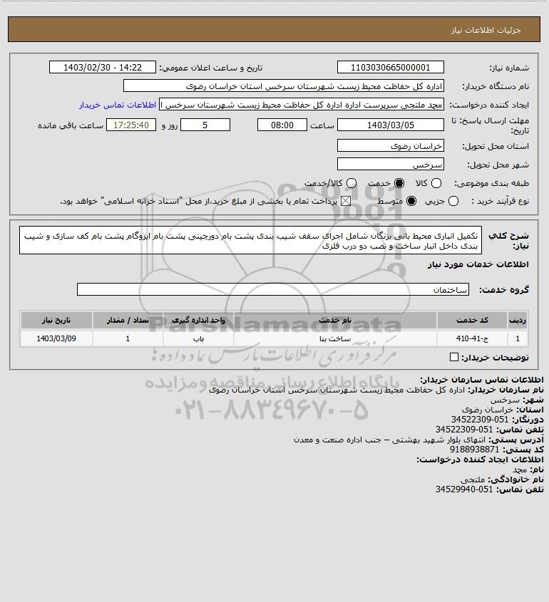 نام سازمان خریدار: اداره کل حفاظت محیط زیست شهرستان سرخس استان خراسان رضوی
