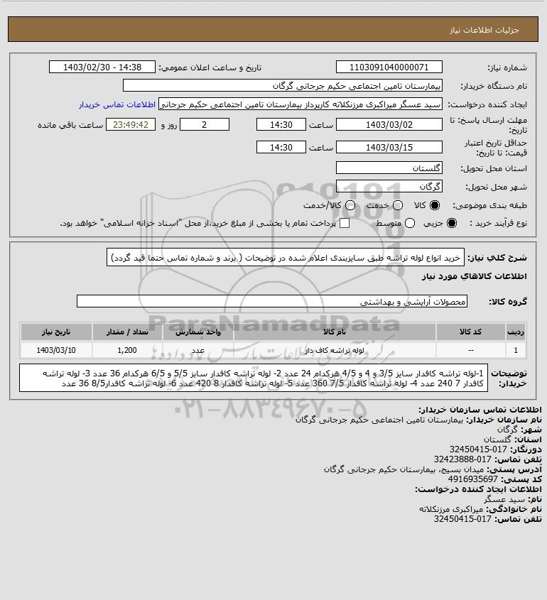 نام دستگاه خریدار:بیمارستان تامین اجتماعی حکیم جرجانی گرگان