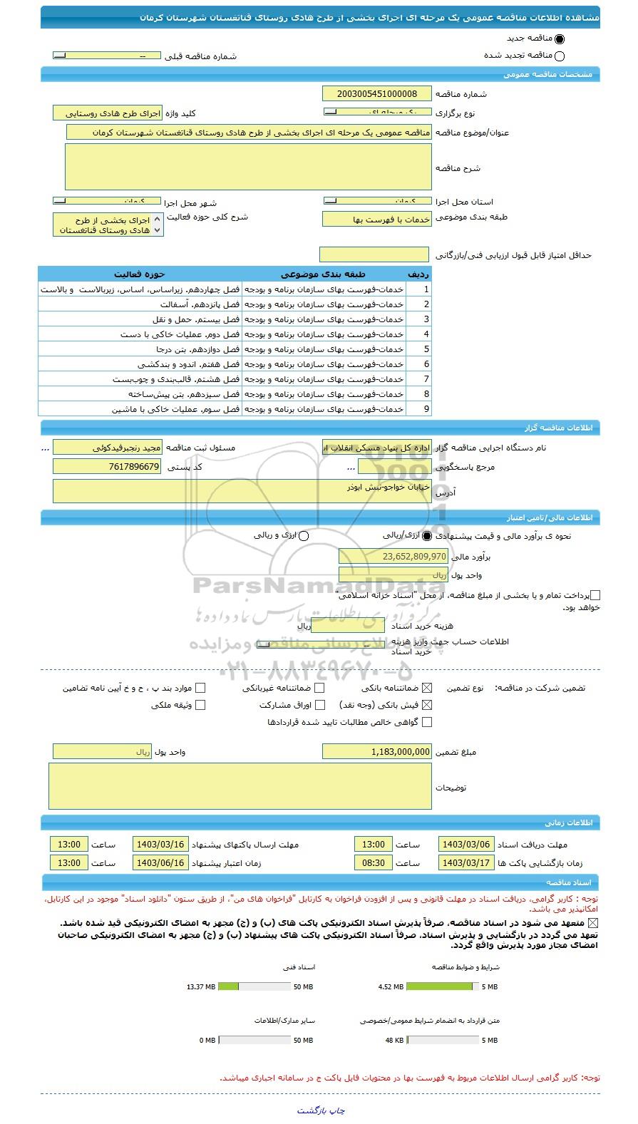 عنوان/موضوع مناقصهمناقصه عمومی یک مرحله ای اجرای بخشی از طرح هادی روستای قناتغستان شهرستان کرمان