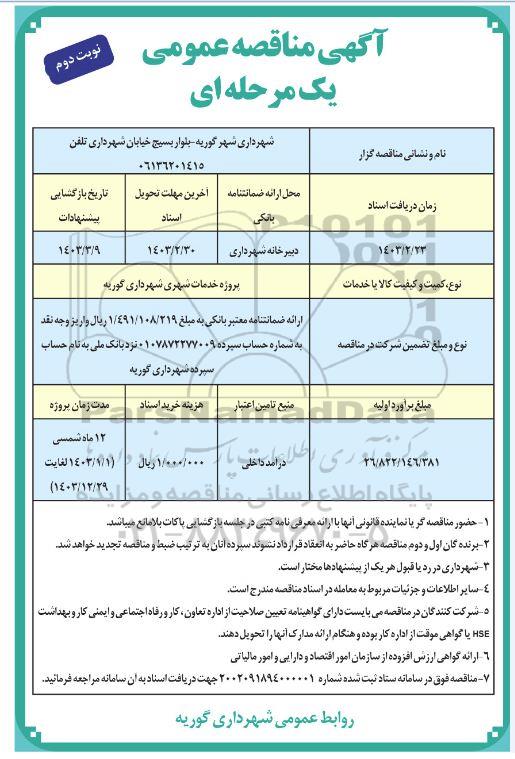 مناقصه پروژه خدمات شهری شهرداری گوریه - نوبت دوم, مناقصه پروژه خدمات شهری شهرداری گوریه - نوبت دوم