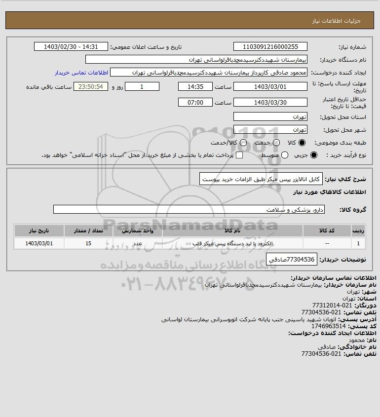 استعلام کابل انالایزر پیس میکر طبق الزامات خرید پیوست, استعلام کابل انالایزر پیس میکر طبق الزامات خرید پیوست