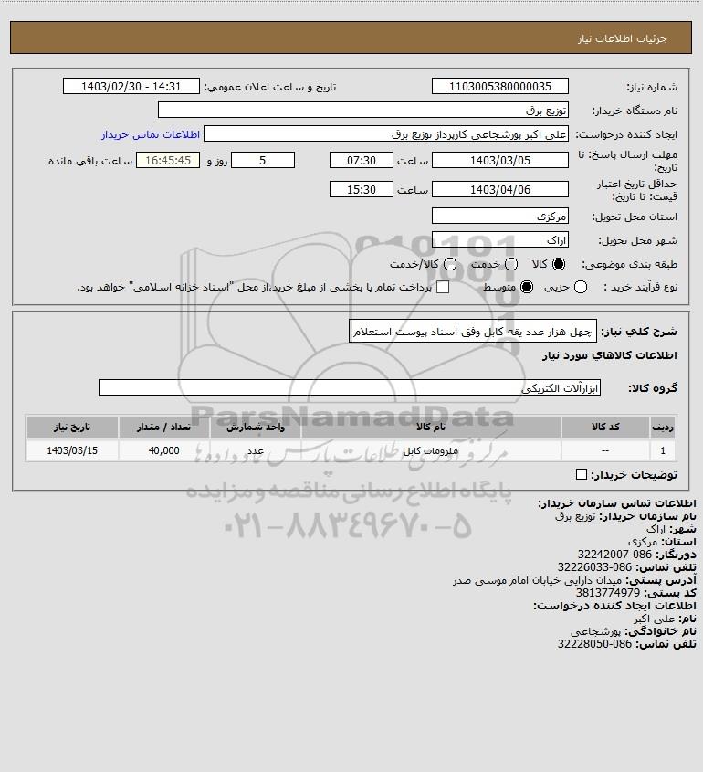 | 1 | -- | ملزومات کابل | عدد | 40,000 | 1403/03/15 |
