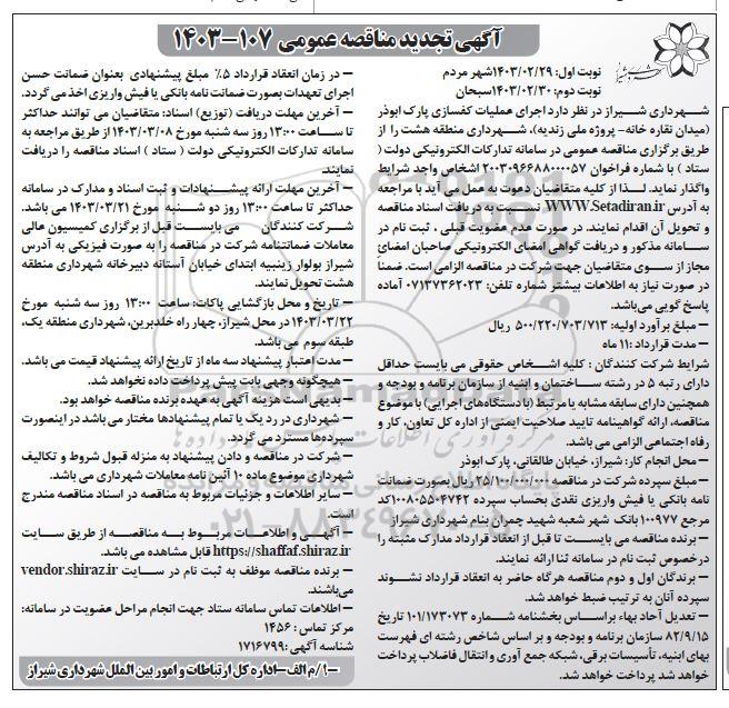 شهرداری شیراز در نظر دارد اجرای عملیات کفسازی پارک ابوذر (میدان نقاره خانه -پروژه ملی زندیه) شهرداری منطقه هشت را از طریق برگزاری مناقصه عمومی در سامانه تدارکات الکترونیکی دولت ) ستاد ) با شماره فراخوان 2003096688000057 اشخاص واجد شرایط واگذار نماید لذا از کلیه متقاضیان دعوت به عمل می آید با مراجعه به آدرس ستاد ایران نسبت به دریافت اسناد مناقصه و تحویل آن اقدام نمایند در صورت عدم عضویت قبلی ، ثبت نام در سامانه مذکور و دریافت گواهی امضای الکترونیکی صاحبان امضای مجاز از سوی متقاضیان جهت شرکت در مناقصه الزامی است. ضمنا در صورت نیاز به اطلاعات بیشتر شماره تلفن : 07137362023 آماده پاسخ گویی می باشد.