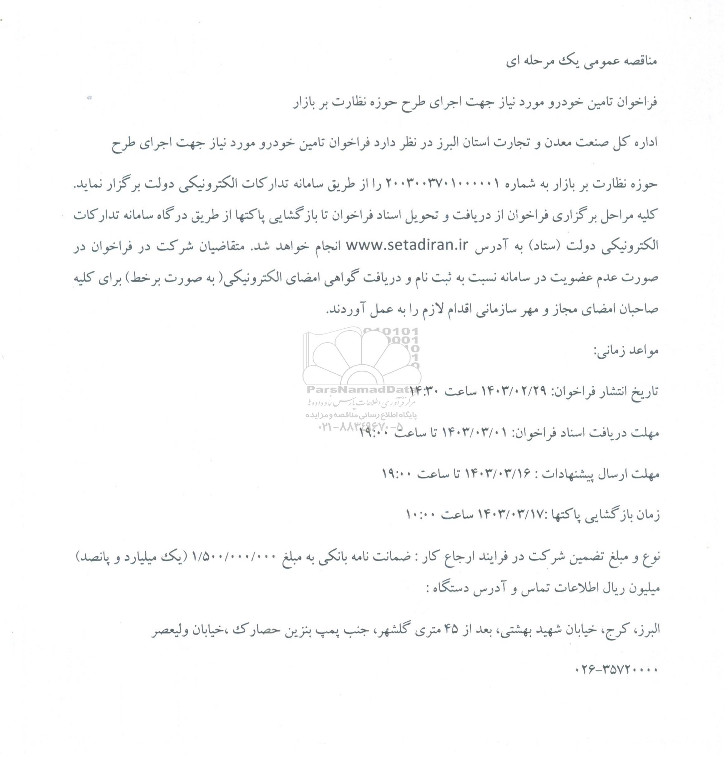 اداره کل صنعت معدن و تجارت استان البرز در نظر دارد فراخوان تامین خودرو مورد نیاز جهت اجرای طرح حوزه نظارت بر بازار به شماره 2003003701000001