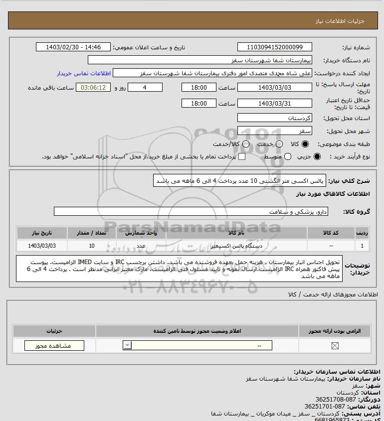 نام دستگاه خریدار:بیمارستان شفا شهرستان سقز