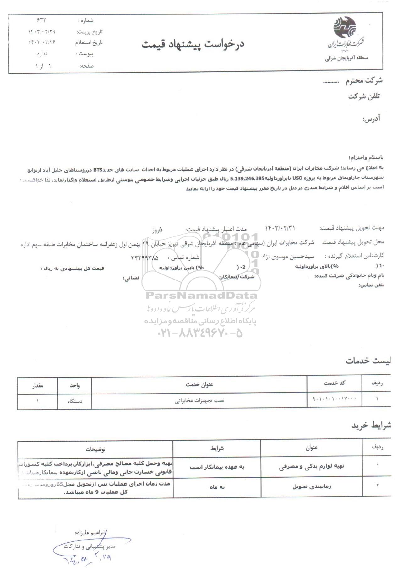 شرکت مخابرات ایران (منطقه آذربایجان شرقی) در نظر دارد اجرای عملیات مربوط به احداث سایت های جدید BTS در روستاهای جلیل آباد از توابع شهرستان چاراویماق مربوط به پروژه USO با برآورد اولیه 5.139.246.395 ریال طبق جزییات اجرایی و شرایط خصوصی پیوستی از طریق استعلام واگذار نماید. لذا خواهشمند است براساس اقلام و شرایط مندرج در ذیل در تاریخ مقرر پیشنهاد قیمت خود را ارائه نمایند.