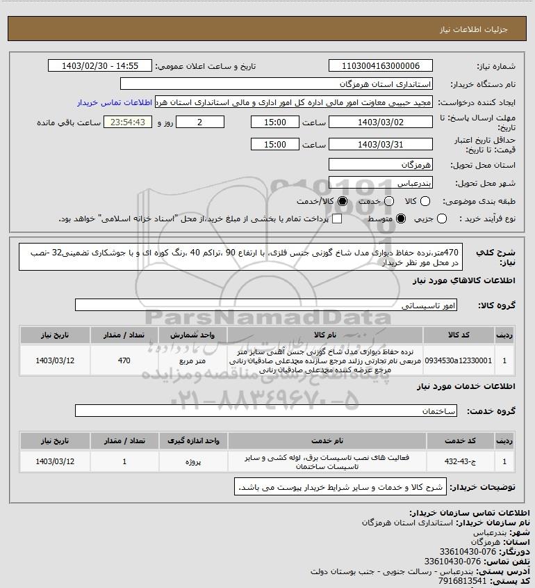 | 1 | 0934530a12330001 | نرده حفاظ دیواری مدل شاخ گوزنی جنس آهنی سایز متر مربعی نام تجارتی رزلند مرجع سازنده محمدعلی صادقیان رنانی مرجع عرضه کننده محمدعلی صادقیان رنانی | متر مربع | 470 | 1403/03/12 |