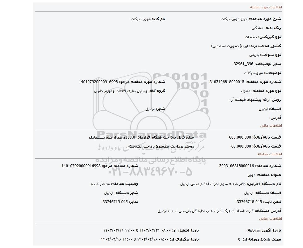 شماره مورد معامله: 3103106818000015 | شماره مورد معامله مرجع: 140107920000916998 | |