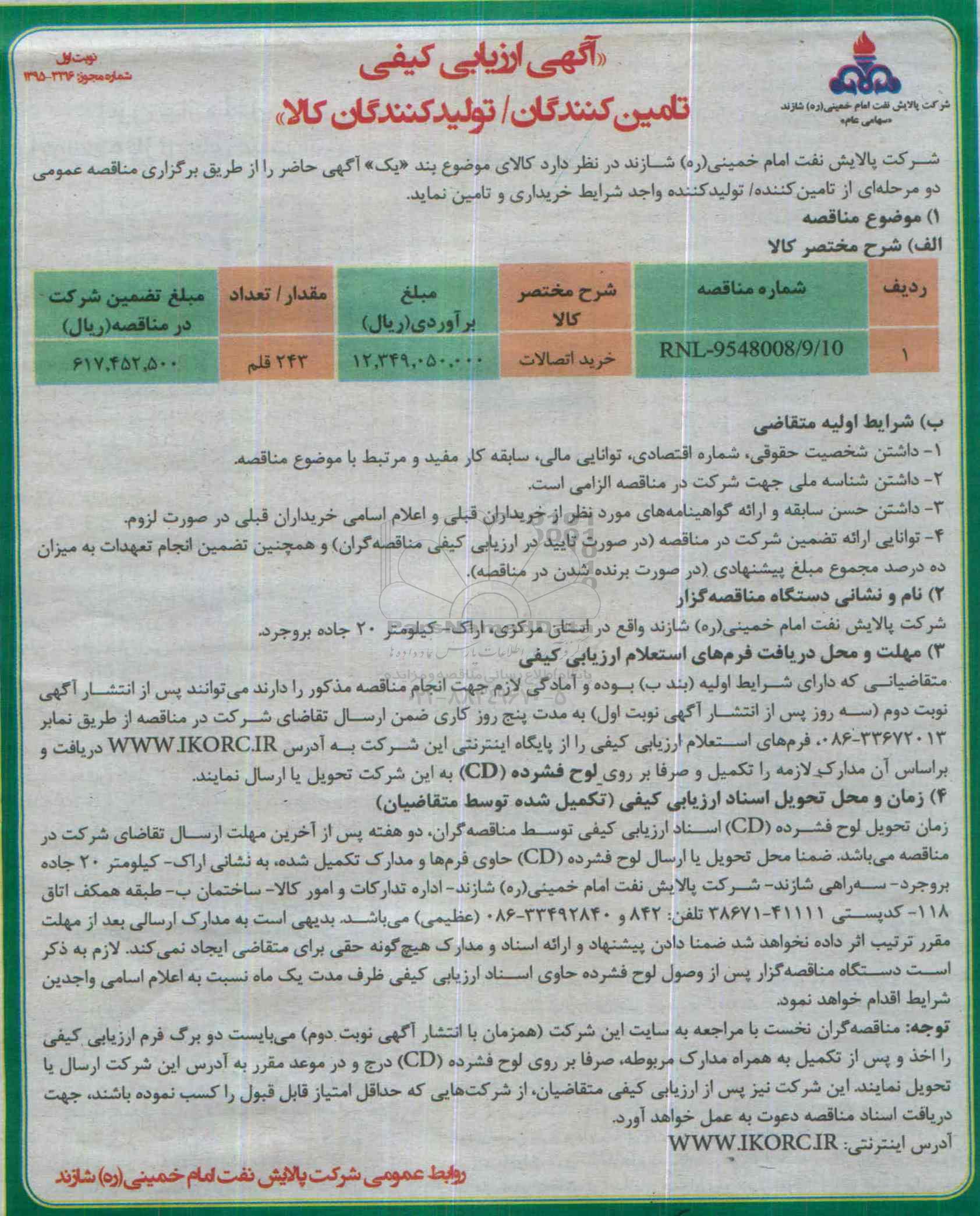 شرکت پالایش نفت امام خمینی (ره) شازند درنظردارد کالای موضوع بند یک اگهی حاضر را ازطریق برگزاری مناقصه عمومی دومرحله ای از تامین کننده واجد شرایط خریداری و تامین نماید