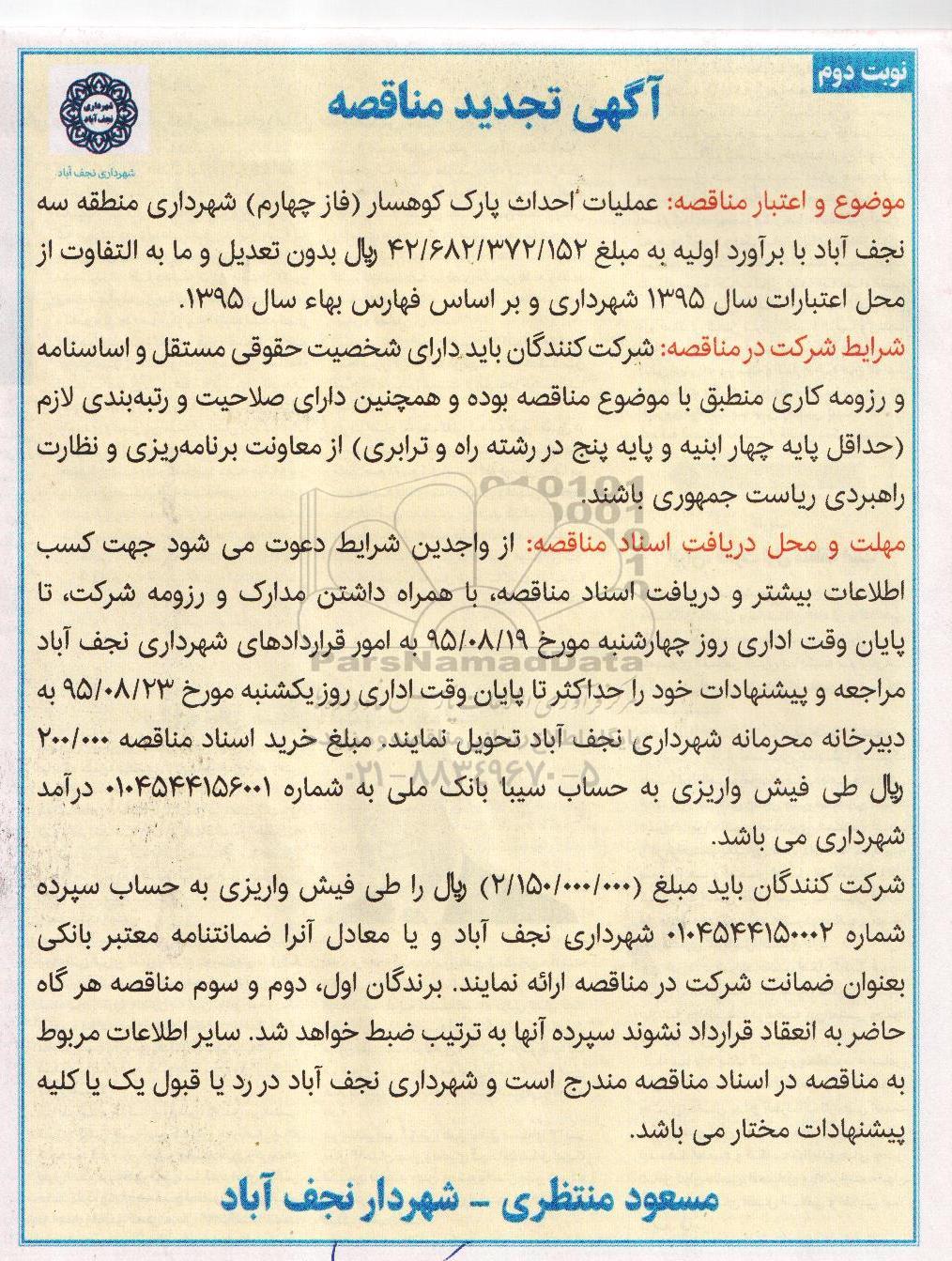 موضوع و اعتبار مناقصه : عملیات احداث پارک کوهسار (فاز چهارم) شهرداری منطقه سه نجف آباد با برآورد اولیه به مبلغ 42.682.372.152 ریال بدون تعدیل و مابه التفاوت از محل اعتبارات سال 95 شهرداری براساس فهارس بهاء سال 95