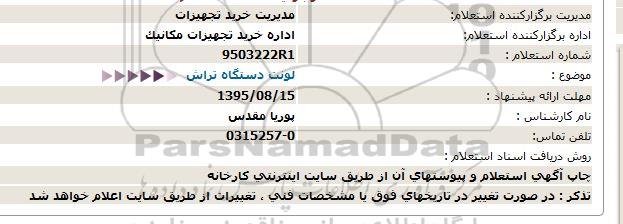 استعلام بها و موضوع استعلام استعلام , استعلام لونت دستگاه تراش به اطلاع کلیه شرکتها و افراد متخصص واجد شرایط میرساند، آگهی گذار در نظر دارد از طریق استعلام بها، نسبت به انتخاب و دریافت پیشنهادات اقدام نماید. این استعلام با کد آگهی ثبت شده در سامانه خبرگزاری پارس نماد : 746996 منتشر شده است. مشخصات استعلام : تاریخ شروع استعلام: 1395/08/10 آخرین مهلت ارسال پیشنهاد قیمت : 1395/08/15 و محل اجرای پروژه : استان اصفهان میباشد. استعلام قیمت مورد درخواست : استعلام , استعلام لونت دستگاه تراش با دستهبندیهای تخصصی و گروه های مرتبط : دستگاه تراش, تجهیزات و ماشین آلات صنعتی, استعلام اطلاع رسانی میگردد.