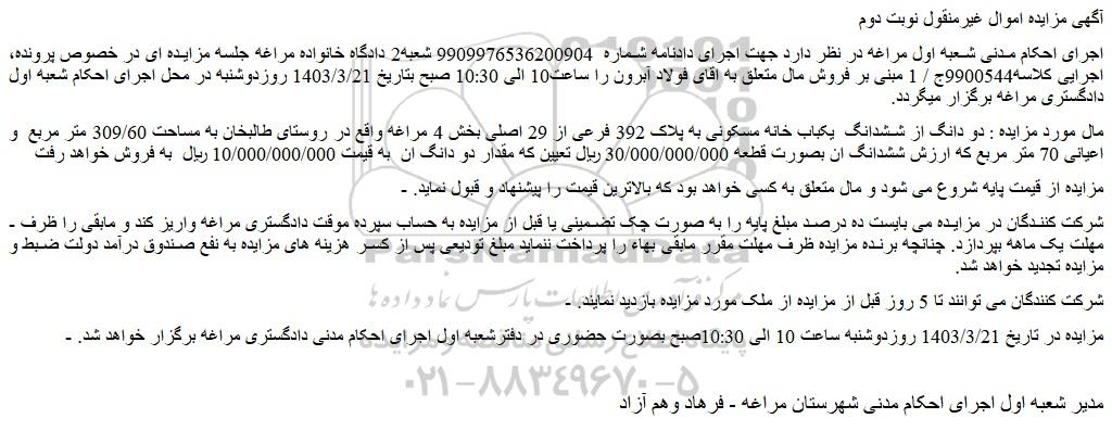 - مزایده در تاریخ 1403/3/21 روزدوشنبه ساعت 10 الی 10:30صبح بصورت حضوری در دفترشعبه اول اجرای احکام مدنی دادگستری مراغه برگزار خواهد شد.