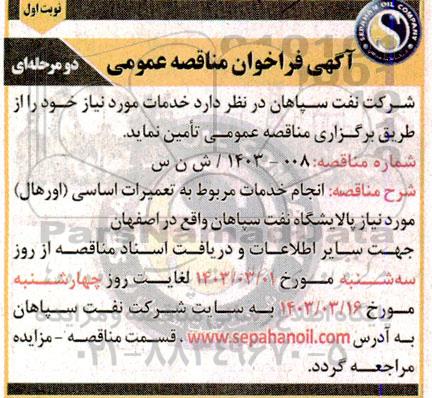 شرح مناقصه : انجام خدمات مربوط به تعمیرات اساسی (اورهال) مورد نیاز پالایشگاه نفت سپاهان واقع در اصفهان