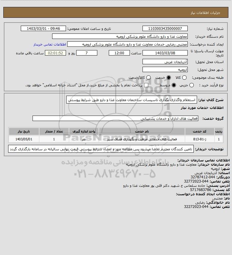 شرح کلی نیاز: استعلام واگذاری نگداری تاسیسات ساختمان معاونت غذا و دارو طبق شرایط پیوستی