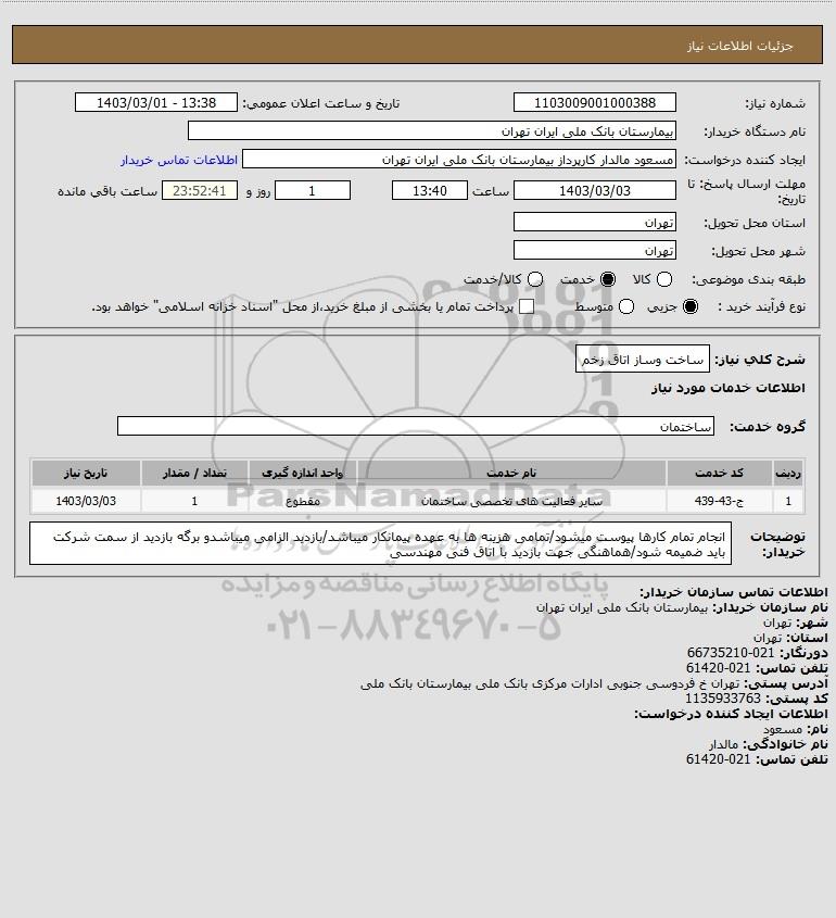 شرح کلی نیاز: ساخت وساز اتاق زخم