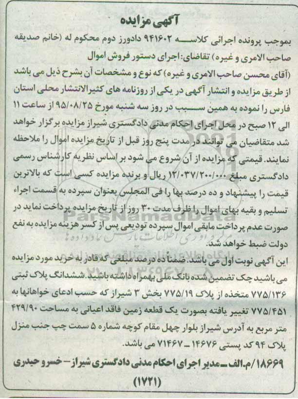 مزایده پلاک ثبتی یک قطعه زمین فاقد اعیانی 429.90متر کلاسه 941602