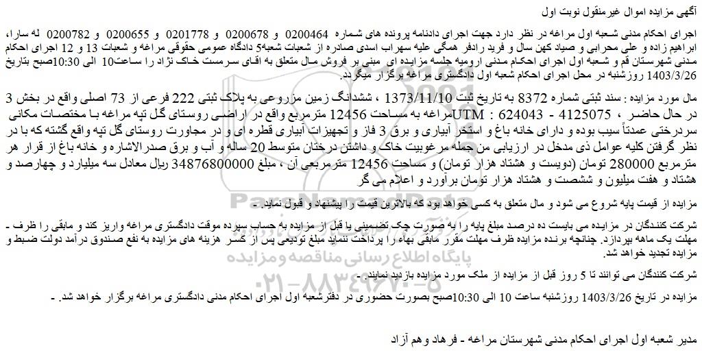 - مزایده در تاریخ 1403/3/26 روزشنبه ساعت 10 الی 10:30صبح بصورت حضوری در دفترشعبه اول اجرای احکام مدنی دادگستری مراغه برگزار خواهد شد.