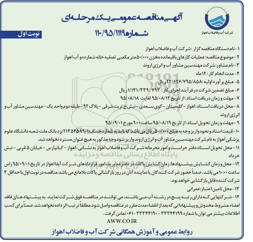 1- نام دستگاه مناقصه گزار: شرکت آب و فاضلاب اهواز