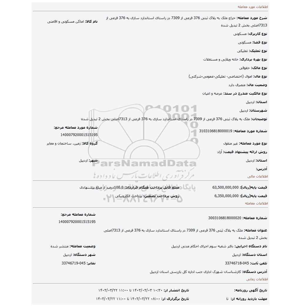 مزایده عمومی ملک به پلاک ثبتی 376 فرعی از 7309 در راستای استاندارد سازی به 376 فرعی از 7313اصلی بخش 2 تبدیل شده برگزار میگردد. از کلیه افراد متخصص و شرکت‌های واجد شرایط دعوت به عمل می‌آید تا در این مزایده با کد خبرگزاری پارس نماد : 7486741 شرکت نمایند تاریخ شروع مزایده : 1403/03/03 مهلت شرکت در مزایده: تا پایان روز 1403/03/22 مکان برگزاری اموال واگذاری استان‌های اردبیل و دسته‌بندی‌های مربوط به این حراجی املاک و زمین میباشد. اطلاعات دقیق‌تر درباره شرایط شرکت در مزایده آنلاین و نحوه ارسال مدارک، الزامات پروژه و دریافت اسناد مزایده و تاریخ بازگشایی پاکت‌ها، در بخش اطلاعات تکمیلی این آگهی درج شده است.