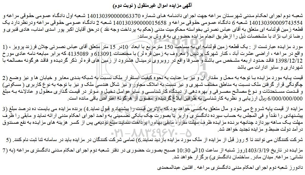 شعبه دوم اجرای احکام مدنی شهرستان مراغه جهت اجرای دادنامه های شماره 140130390000063370 شعبه اول دادگاه عمومی حقوقی مراغه و 140130390009743554 شعبه 6 دادگاه عمومی حقوقی مراغه و 140130390000015658 شعبه 2 دادگاه عمومی حقوقی مراغه ودرنظردارد یک قطعه زمین قولنامه ای متعلق به آقای عباس نصرتی بخواسته محکومیت مدنی (حکم به پرداخت وجه نقد ) درحق آقایان اکبر پور اسدی امناب، هادی قنبری و رضا تراب نژاد با مشخصات ذیل را ازطریق انجام مزایده حضوری به فروش برساند: