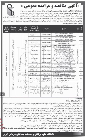 دانشگاه علوم پزشکی و خدمات بهداشتی درمانی ایران در نظر دارد موضوعات مشروحه ذیل را از طریق مناقصه مزایده عمومی به بخش خصوصی واگذار نماید. متقاضیان واجد شرایط می توانند اسناد مربوطه را در سایت دانشگاه علوم پزشکی ایران یا پایگاه ملی مناقصات مطالعه نموده و در صورت تمایل دانشگاه علوم پزشی و خدمات بهداشتی درمانی ایران به تهیه اسناد طبق توضیحات مندرج در ذیل جدول اقدام نمایند. لازم به ذکر است دانشگاه علوم پزشکی ایران در قبال اطلاعات سایتهای متفرقه پذیرای هیچگونه مسئولیتی نمی باشد و پس از خرید اوراق به هیچ عنوان مبالغ دریافتی عودت داده نخواهد شد.