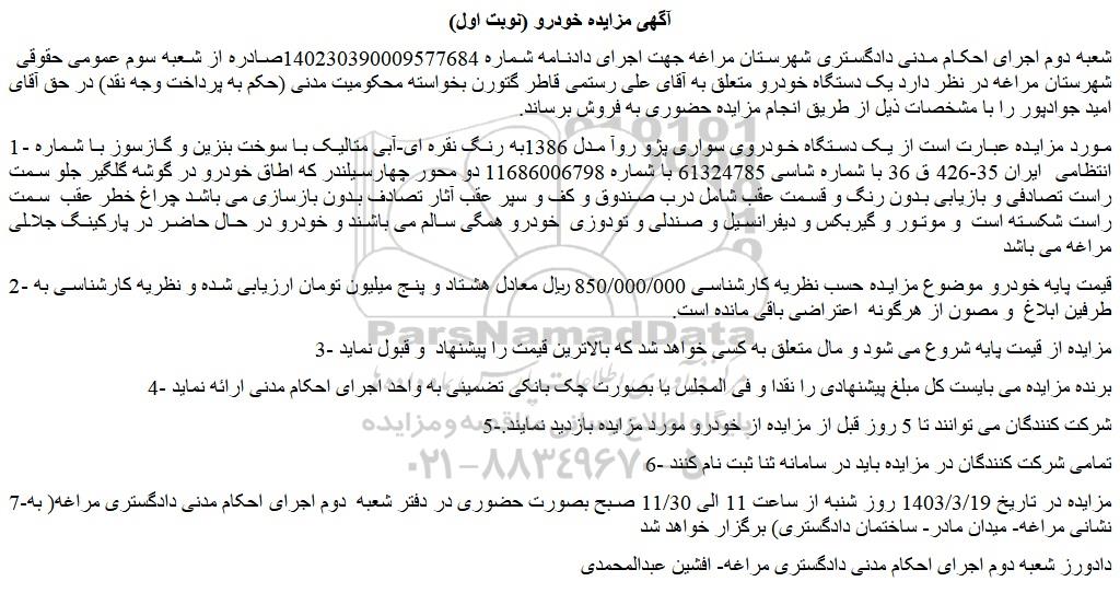 شعبه دوم اجرای احکام مدنی دادگستری شهرستان مراغه جهت اجرای دادنامه شماره 140230390009577684صادره از شعبه سوم عمومی حقوقی شهرستان مراغه در نظر دارد یک دستگاه خودرو متعلق به آقای علی رستمی قاطر گتورن بخواسته محکومیت مدنی (حکم به پرداخت وجه نقد) در حق آقای امید جوادپور را با مشخصات ذیل از طریق انجام مزایده حضوری به فروش برساند.