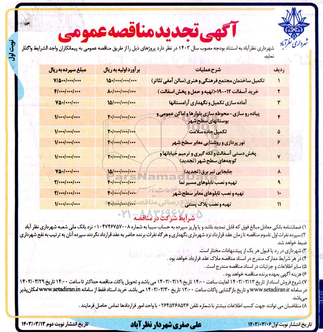 شهرداری نظرآباد به استناد بودجه مصوب سال 1403 در نظر دارد پروژه های ذیل را از طریق مناقصه عمومی به پیمانکاران واجد الشرایط واگذار نماید