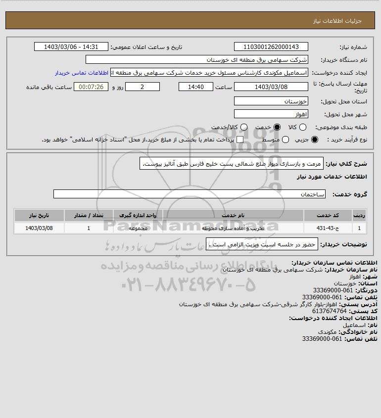 شرح کلی نیاز: مرمت و بازسازی دیوار ضلع شمالی پست خلیج فارس طبق آنالیز پیوست.