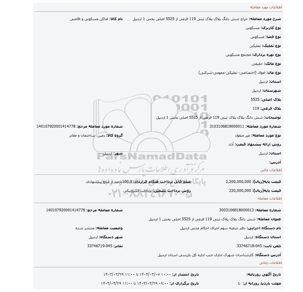 شرح مورد معامله: حراج شش دانگ پلاک پلاک ثبتی 119 فرعی از 5525 اصلی بخش 1 اردبیل نام کالا: اماکن مسکونی و اقامتی
