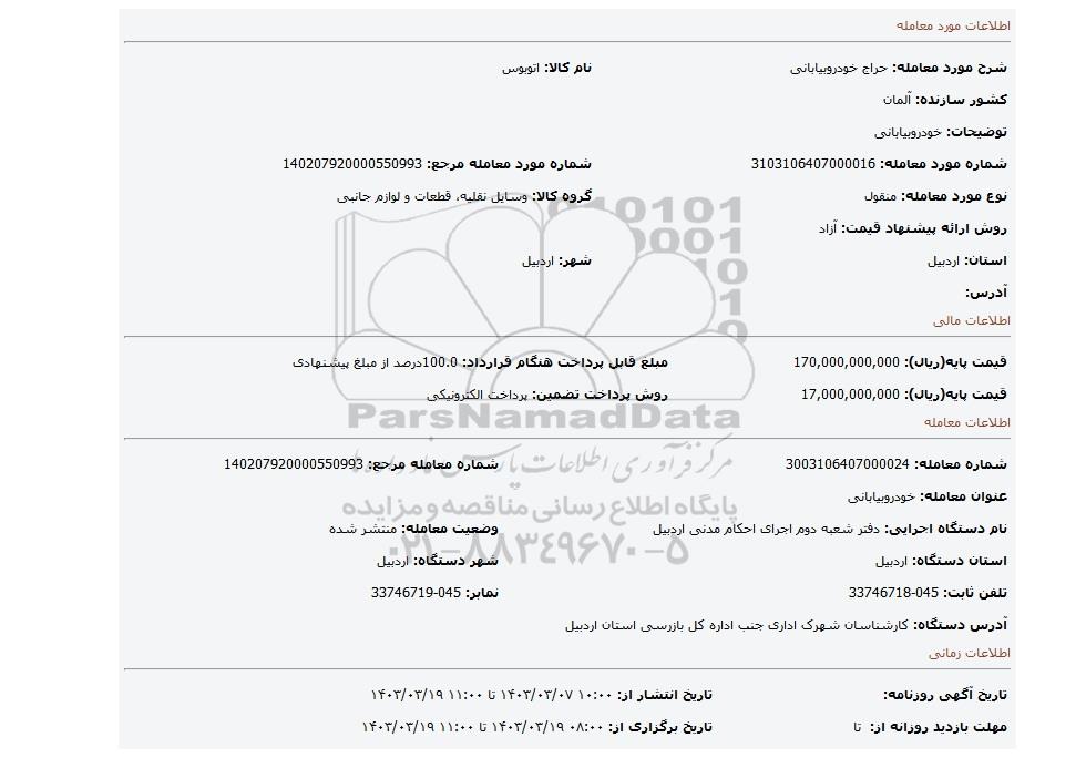 شرح مورد معامله: حراج خودروبیابانی | نام کالا: اتوبوس | |