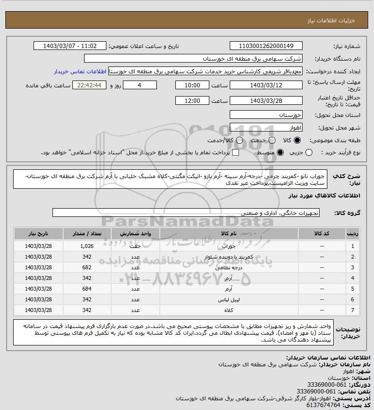 شرح کلی نیاز: جوراب نانو -کمربند چرمی -درجه-آرم سینه -آرم بازو -اتیکت مگنتی-کلاه مشبک خلبانی با آرم شرکت برق منطقه ای خوزستان- سایت ویزیت الزامیست.پرداخت غیر نقدی