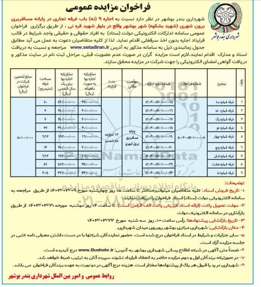 شهرداری بندر بوشهر در نظر دارد نسبت به اجاره 9 باب غرفه تجاری در پایانه مسافربری برون شهری (شهید بشکوه) شهر بوشهر واقع در بلوار شهید قره نی، از طریق برگزاری فراخوان عمومی سامانه تدارکات الکترونیکی دولت ستاد به افراد حقیقی و حقوقی واجد شرایط در قالب قرارداد اجاره بدون اخذ سرقفلی اقدام نماید. لذا از کلیه متقاضیان دعوت به عمل می آید مطابق جدول زمانبندی ذیل به سامانه مذکور به آدرس سایت ستاد ایران مراجعه و نسبت به دریافت اسناد و مدارک اقدام نمائید. لازم است مزایده گران در صورت عدم عضویت قبلی مراحل ثبت نام در سایت مذکور و دریافت گواهی امضای الکترونیکی را جهت شرکت در مزایده محقق سازند.