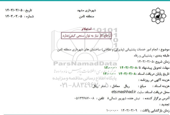 موضوع : انجام امور خدمات پشتیبانی (پذیرایی و نظافتی) ساختمان های شهرداری منطقه ثامن