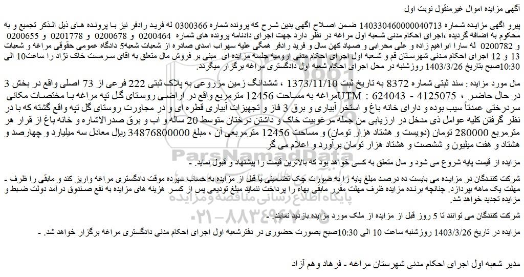 پیرو اگهی مزایده شماره 140330460000040713 ضمن اصلاح اگهی بدین شرح که پرونده شماره 0300366 له فرید رادفر نیز با پرونده های ذیل الذکر تجمیع و به محکوم به اضافه گردیده ،اجرای احکام مدنی شعبه اول مراغه در نظر دارد جهت اجرای دادنامه پرونده های شماره 0200464 و 0200678 و 0201778 و 0200655 و 0200782 له سارا ابراهیم زاده و علی محرابی و صیاد کهن سال و فرید رادفر همگی علیه سهراب اسدی صادره از شعبات شعبه5 دادگاه عمومی حقوقی مراغه و شعبات 13 و 12 اجرای احکام مدنی شهرستان قم و شعبه اول اجرای احکام مدنی ارومیه جلسه مزایده ای مبنی بر فروش مال متعلق به اقای سرمست خاک نژاد را ساعت10 الی 10:30صبح بتاریخ 1403/3/26 روزشنبه در محل اجرای احکام شعبه اول دادگستری مراغه برگزار میگردد.