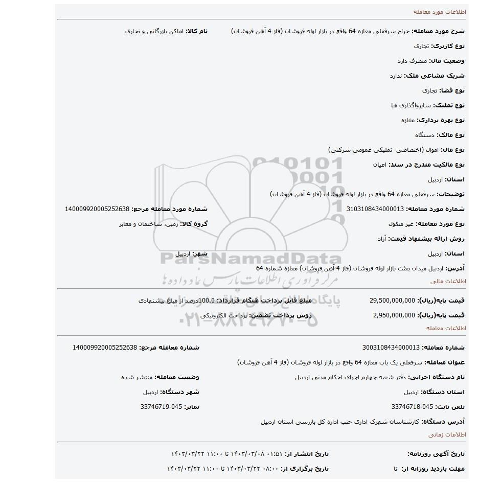 شرح مورد معامله: حراج سرقفلی مغازه 64 واقع در بازار لوله فروشان (فاز 4 آهن فروشان) | نام کالا: اماکن بازرگانی و تجاری | |