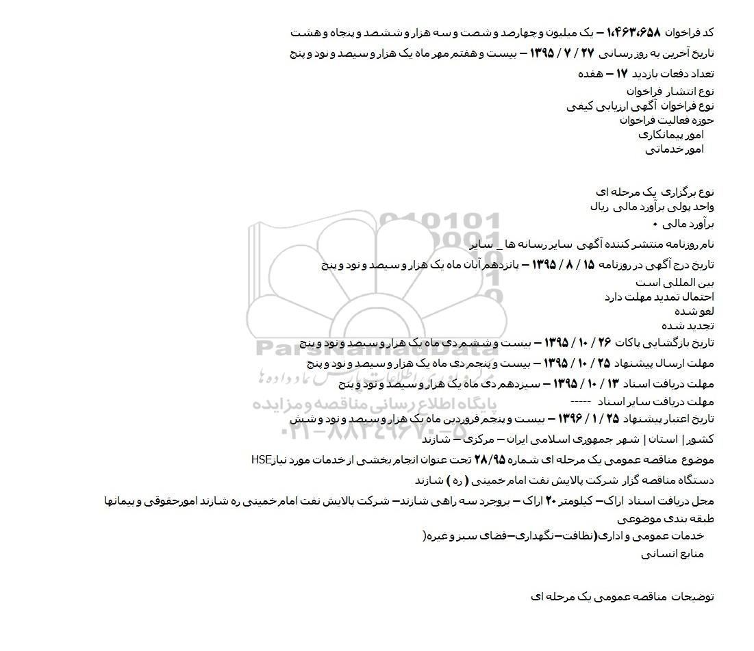 موضوع مناقصه عمومی یک مرحله ای شماره ۲۸/۹۵ تحت عنوان انجام بخشی از خدمات مورد نیازHSE