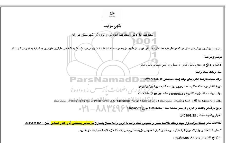 مدیریت آموزش وپرورش شهرستان مراغه در نظر دارد فضاهای تحت نظر خود را از طریق مزایده در سامانه تدارکات الکترونیکی دولت (ستاد) به اشخاص حقیقی و حقوقی واجد شرایط به اجاره واگذار نماید.
